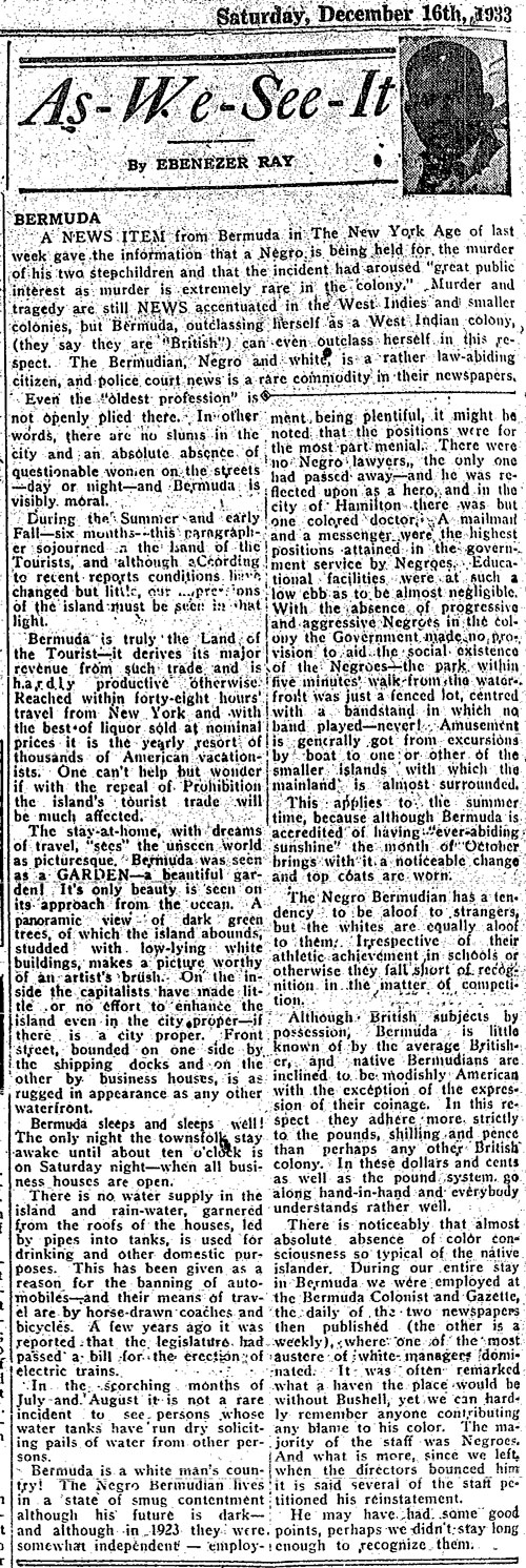 The Ellis Island record of my father’s arrival in the U.S. – his last name was “Wray” then – says he arrived from Hamilton Bermuda in 1923 at age 26. The record clearly states that he was born in Barbados, so until I found these columns I was not sure what the Bermuda connection was. Now I know! He worked for the Bermuda Colonist and Gazette, a daily, while there.