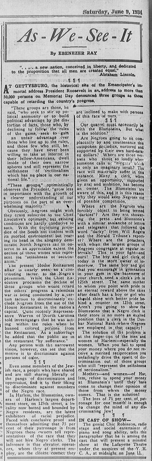 Tags: 1934, african american history, black history, Blumstein's, Chic Robinson, harlem, journalism, new york, the black press, the new york age