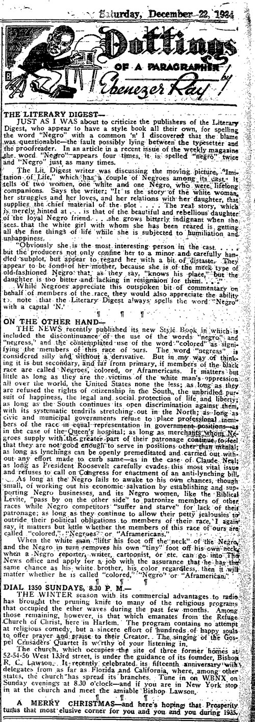 “When the white man ‘lifts his foot off the neck’ of Negroes and when the Negro in turn lifts his own tiny foot off his own neck, when a Negro reporter, writer, cartoonist, or etc. can go to the News office and apply for a job with the assurance that he has the same chance as his white brother, his color regardless, then it will matter whether he is called colored, Negro, or Aframerican”