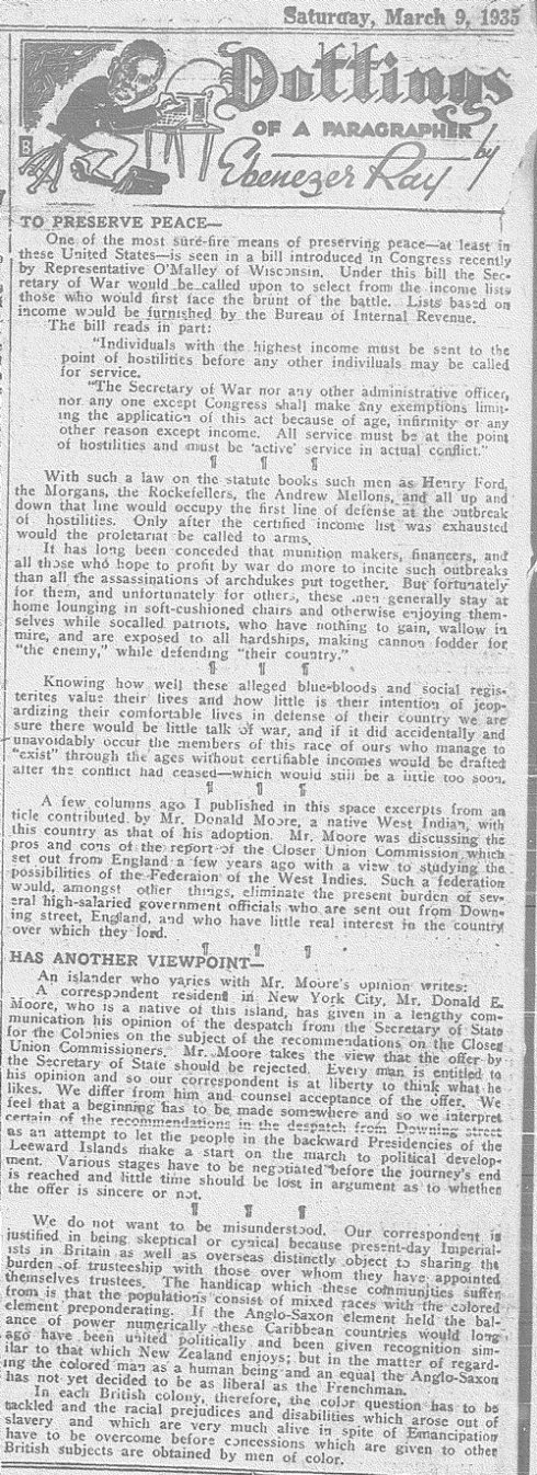 In the latter half of the column Ebenezer offers a counter argument to fellow West Indian writer Donald Moore, whom my father quoted extensively in his “Dottings” column on Jan. 26 of that year. The column examined the recommendations of what was called the Closer Union Commission, which was considering a West Indian Federation.
