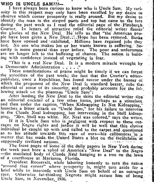 “The front pages of some of the daily papers in New York during the week past bore a symbol of America’s ‘New Deal’ to the Negro — the mutilated body of Claude Neal hanging [from] a tree on the lawn of a courthouse in Marianna, Florida. President Roosevelt, while laboring honestly to turn the nation ‘around the corner’ where prosperity is, might turn aside for a brief while to intercede with Uncle Sam on behalf of an outraged race. Otherwise, far-thinking Negroes might accuse him of being Uncle Sam, in November 1936.”