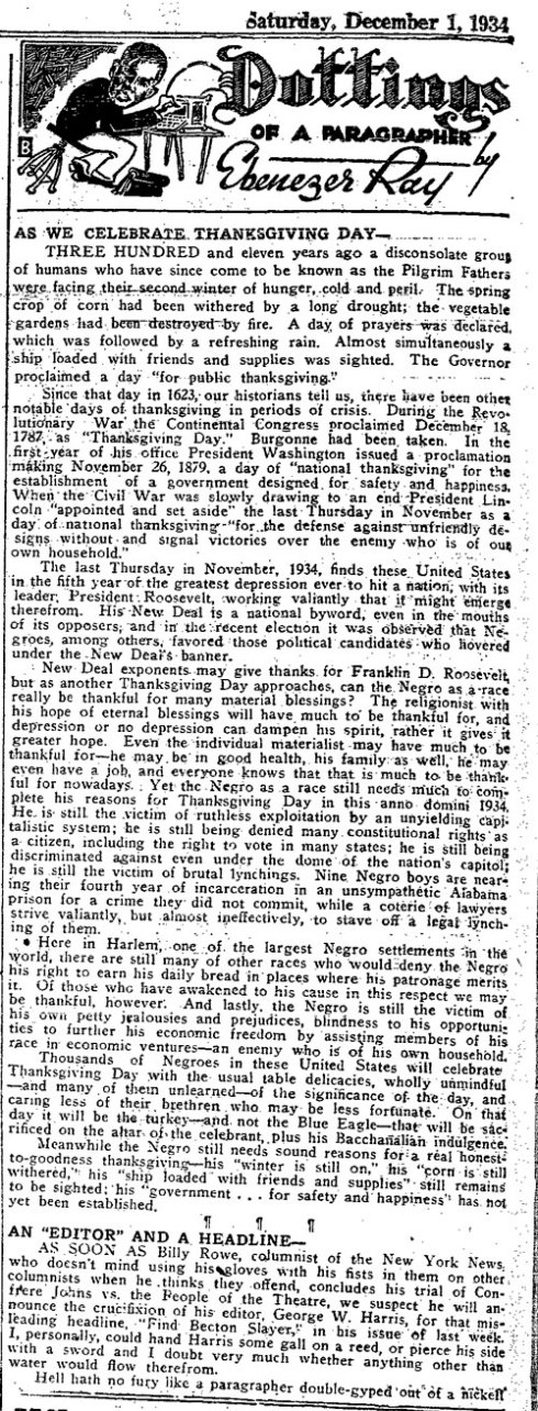 “As another Thanksgiving Day approaches, can the Negro as a race really be thankful for many material blessings? . . . Even the individual materialist may have much to be thankful for – he may be in good health, his family as well, he may even have a job and everyone knows that that is much to be thankful for nowadays. Yet the Negro as a race still needs much to complete his reasons for Thanksgiving Day in this anno domini 1934. He is still the victim of ruthless exploitation by an unyielding capitalist system; he is still being denied many constitutional rights as a citizen, including the right to vote in many states; he is still being discriminated against even under the dome of the nation’s capitol; he is still the victim of brutal lynchings. Nine Negro boys are nearing their fourth year of incarceration in an unsympathetic Alabama prison for a crime they did not commit, while a coterie of lawyers strive valiantly, but almost ineffectively to stave off a legal lynching of them.
