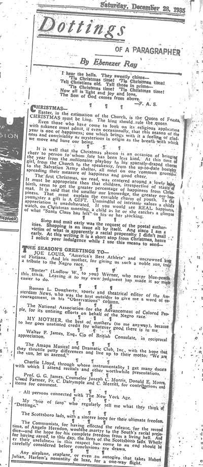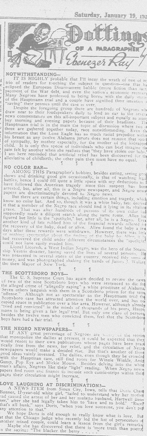 Speaker Byrns ignored Mr. Sweeney. Negroes might sympathize with Mr. Sweeney in the loss of his kin, but it is natural that they at the same time reflect on the atrocities which are committed under America’s ‘democracy” In the first place we have hundreds of lynchings which have taken place in the direction from which Mr. Sweeney hails and against which Congress up to its last session refused to enact legislation. Many a Negro has lost his innocent kin by these barbarous methods. The Fourteenth and Fifteenth amendments to the constitution as they apply to Negroes are openly violated in the South. Under the shadow of the Capitol’s dome, Negroes have been denied use of the House Restaurant and even in the North Negroes are systematically and occasionally discriminated against in government and private institutions. Lastly, we come to the persecution of the nine Scottsboro lads. Within the columns of the issue of the New York Times which voices Mr. Sweeney’s objection we read that the trial was being conducted for the fourth time amidst the most prejudiced atmosphere perhaps known to any court in a civilized country.”
