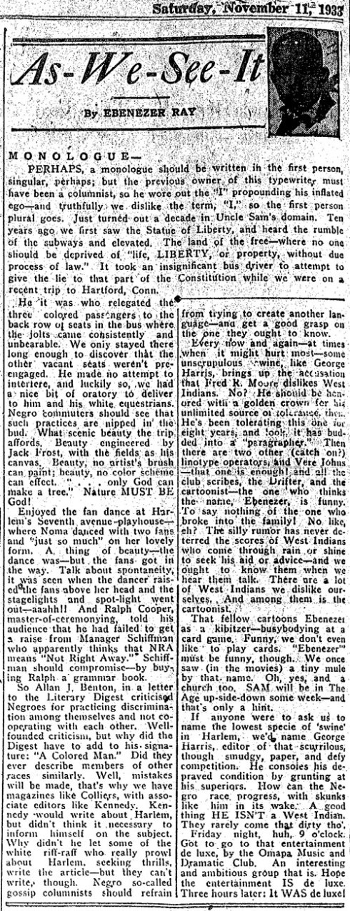 He noted that in Barbados, it was the speaker – not the spoken to – who was looked upon as uncultured when the word was used. He took issue with one of his fellow New York Age columnists, who was Jamaican, who generalized that in the West Indies the word was used to refer to the black laborer.