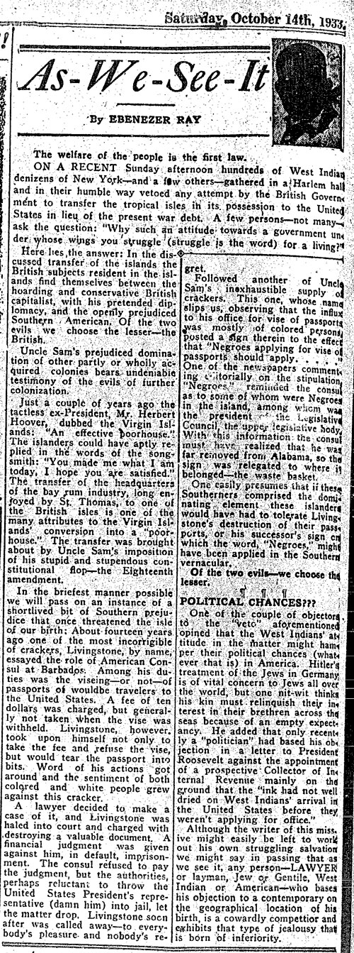 18 JunHaven’t found out much about George Harris, but it is interesting the a “newspaper man” would be running for office. It’s clear Ebenezer didn’t think much of Harris. He suggests that he looks like a bulldog, that he is being used by his white predecessor to attempt to “jar the wheels off Negro progress.” In previous columns he urged readers to vote for Harris’ opponent Fred Moore, who I recently discovered was also a newspaper man – the editor of of the New York Age. So not only are two newspapermen running for office, but my dad is endorsing the man who essentially signs his paycheck! Even after Moore prevailed, Ebenezer saw fit to kick Harris one more time.