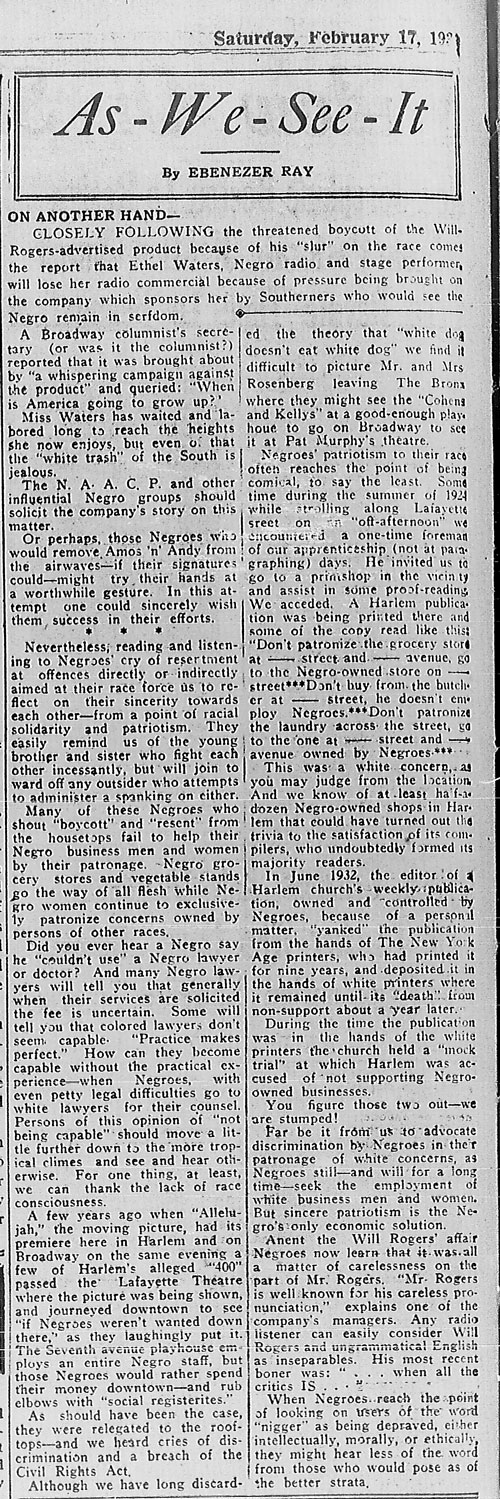 So “we’ve” gotten off the subject of Will Rogers and his reference to “darkies,” and now back to the “tiff” between American born and immigrant blacks. This column, published April 7, 1934, takes a circuitous path to get to the point, touching on Mussolini, the reluctance of black folks to hire the services of Negro lawyers and the fact that black people are barred from eating in Washington, DC’s government-owned restaurants. He mentions Dr. Godfrey Nurse a physician born in Guyana who served on the New York State Electoral College. He quotes James S. Watson, a Jamaican-born municipal court judge.