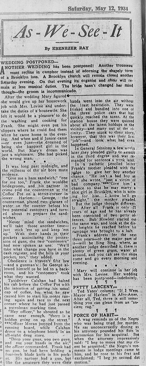Then, while looking for a column to feature this week, I came across one my father published on April 14, 1934 titled “If I were Mayor of Harlem.” It is one of several “If I were . . . ” pieces Ebenezer wrote, including “If I were editor ” and “If I were the Hitler of Harlem.” (I’m not quite ready to delve into that one.)